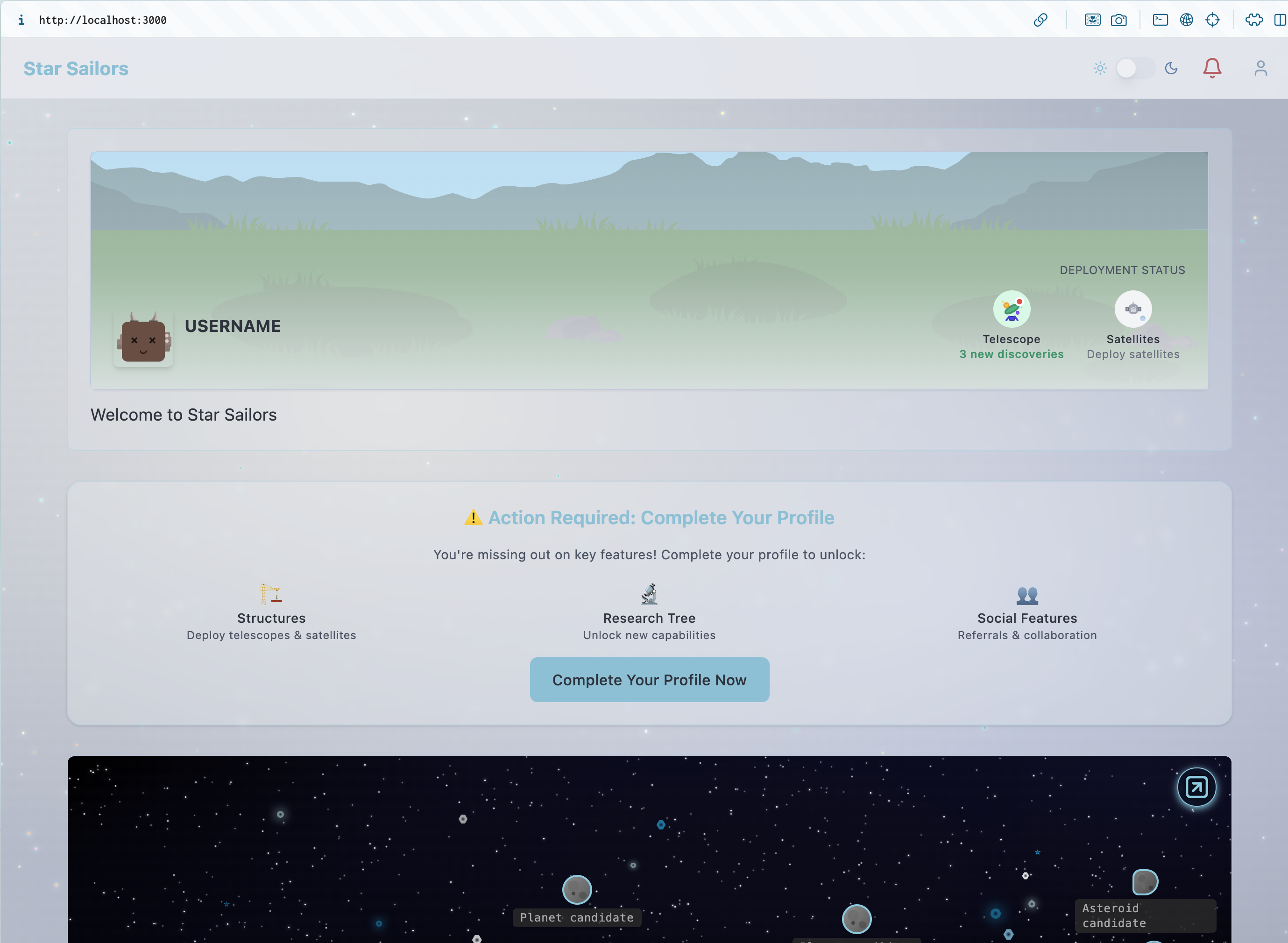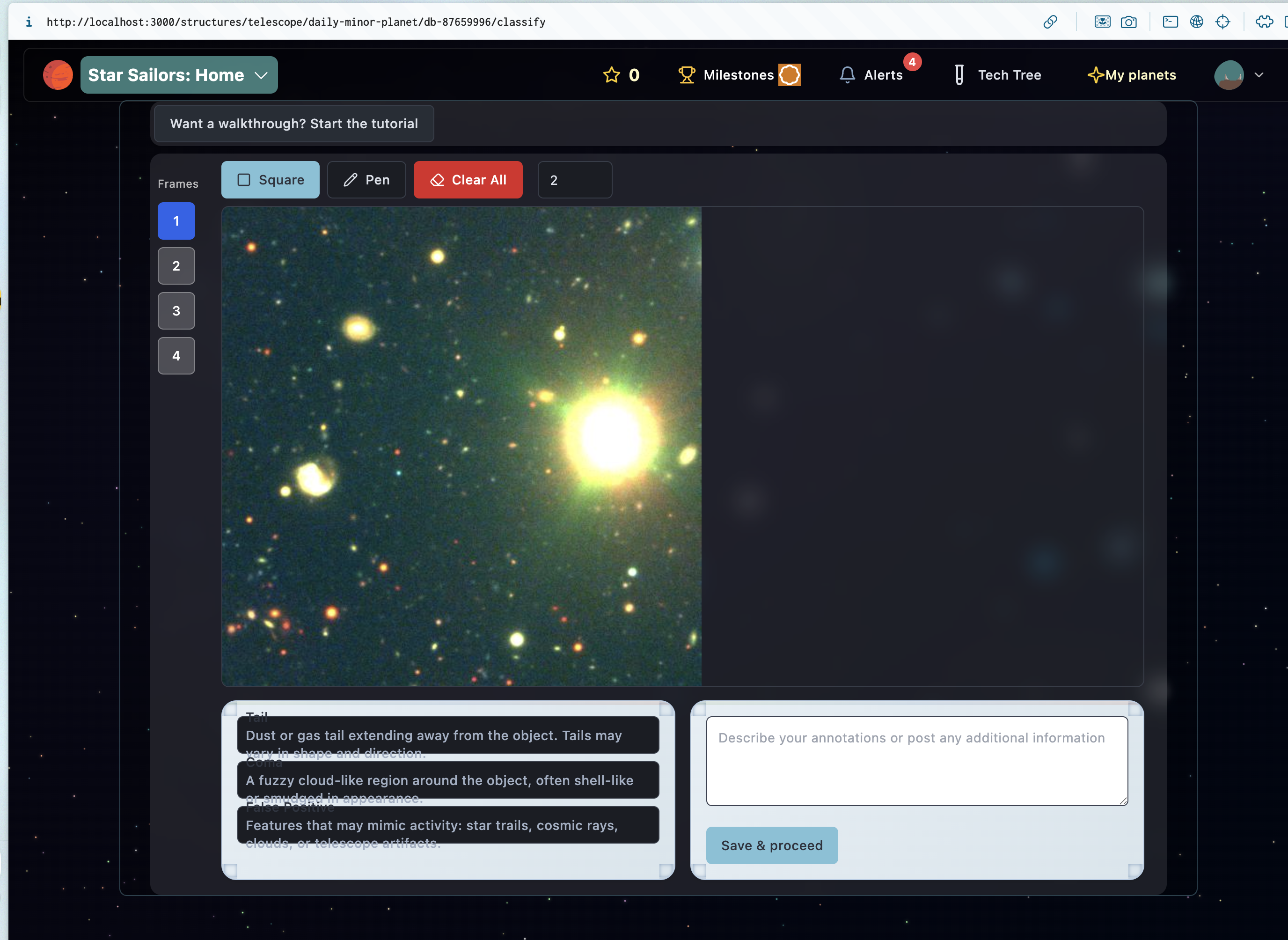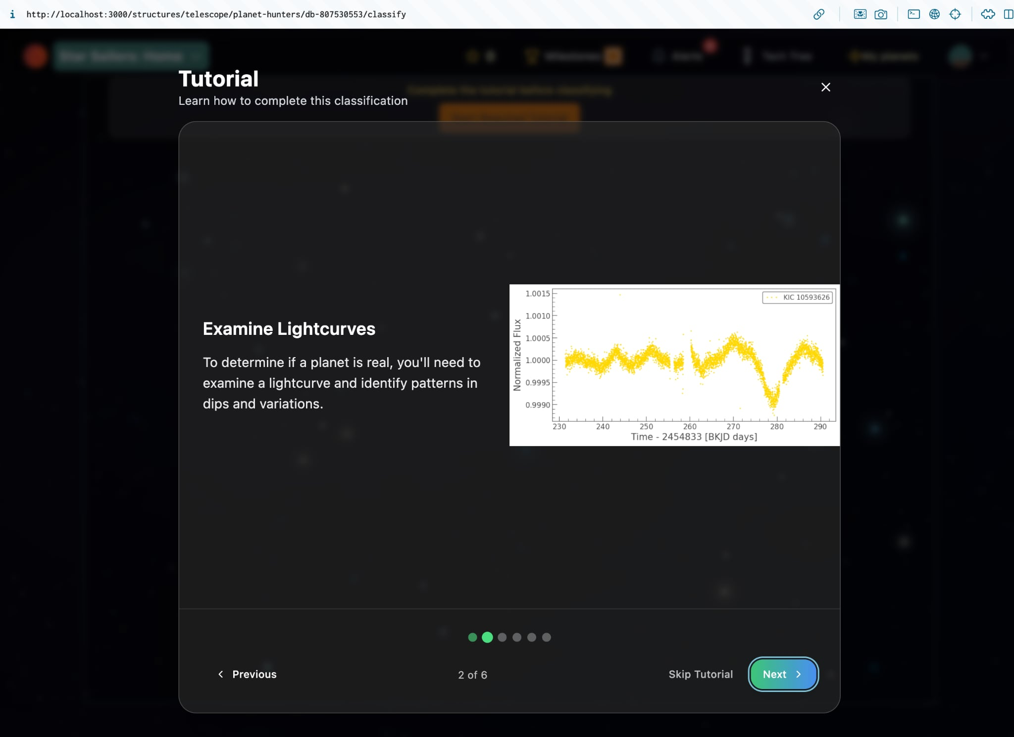 I think, instead, I’ll add a little “Your Progress” card that can show the user the basics and their progress towards “getting started”. For example, we’ll show users the structures/tools they’ve interacted with, and their skills. Plus buttons to “improve their skills” (i.e. make more classifications).